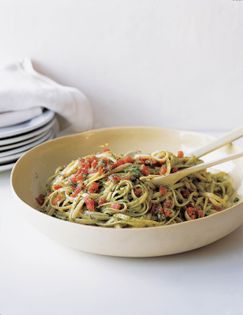 Basil pesto mixed with fresh raw tomatoes makes a truly delicious summer pasta sauce.