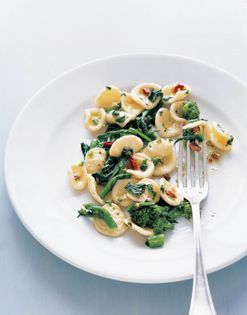 This is the dish most often associated with Apulia, the region of Italy where the spur and the heel of the boot are. Factory-made orecchiette can be very good and are fairly easily available. Broccoli rabe (sometimes called rapini) with olive oil, garlic, and anchovies is the classic sauce served with orecchiette. The broccoli rabe is cooked with the pasta, which absorbs some of the its flavor.
