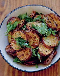 We are blessed to be just a few blocks from the Santa Monica Farmers’ Market. Every week we get the most wonderful potatoes from Weiser Farms, which may very well be the best potatoes in the world. The quality of your potatoes does really make a difference, so try to get your hands on the best you can find. If you can’t find fingerlings, you can use Yukon golds, Red Bliss, or White Rose. Anything but russets, as the texture just doesn’t work.