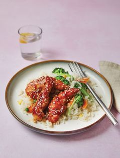 My kids love this sweet and sticky chicken served up with colourful rainbow veggie rice.