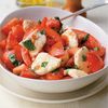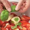 This classic, simple summer salad of tomatoes and mozzarella comes from the beautiful island of Capri. The juice from the ripe tomatoes and the whey from the cheese will seep out to create liquid around the salad - this is delicious soaked up with plenty of crusty bread. The cheese should be perfectly fresh and juicy, whether it is made from buffalo milk or not. The basil leaves must always be torn, and never cut with a knife or scissors, because this alters the flavour and blackens the lea