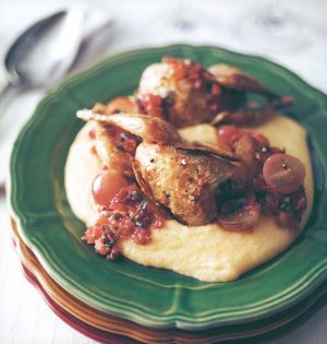 September is quail season in the Veneto, and it is also harvesttime in the vineyards, making this dish using quail, grapes, and sage a natural autumn dinner. As the Italians would say, si sposa, “it marries.” You can also make it with poussins or Cornish hens, increasing the cooking time to about an hour and serving one per person. I have even seen versions of this recipe made with a small turkey. Serve the quail reclining on a bed (sul letto) of polenta. You can season the po