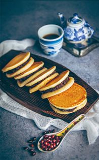 These little, round, bronze pancake sandwiches called dorayaki are normally brimming with red bean paste. The paste itself is made from maroon adzuki beans boiled with sugar and then mashed into a silky puree. If you are not a fan of red bean paste, these pancakes can also be stuffed with a vegan chocolate spread.