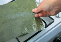 After toasting the nori as shown below, cut it into 4 squares. Place 1 nori square diagonally in your left hand, shiny side facing down.