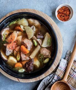 In the small town where I first lived, I went to a little restaurant that specialized in pork. I couldn’t read the menu, so the waitress brought me their most popular dish, tonjiru. In Japan, pork belly (baraniku) is used for this soup. If you can find burdock root (gobo), peel it and use in place of the parsnip.