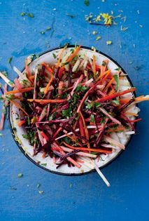 We make this salad in the winter or early spring, before any of the summer crops are around. It is incredibly fresh, ideal for starting a hearty meal. It is also great served alongside grilled oily fish. The labneh can be substituted with Greek yoghurt, well seasoned with some olive oil, crushed garlic and salt and pepper. It can also be left out all together, if you prefer to keep it light and simple. This recipe was inspired by a dish from Manta Ray, a great restaurant on the beach in Tel