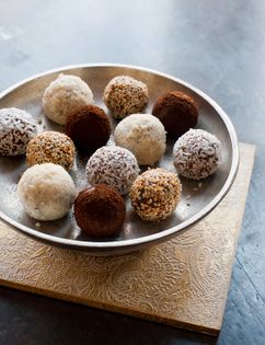 Known as both an aphrodisiac and the poor man’s food, there are more than 400 varieties of date available in Iraq. These include soft and semi-soft, or dry dates, also known as bread dates. The tahini is a wonderful nutty addition to this recipe. The truffles are suitable for gluten- and dairy-free eaters. Listed below are just some ideas for coatings, which you can, of course, adapt to your taste.