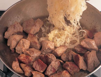 This tangy sauerkraut is simmered with veal and onions, tinted with paprika and spiced with mustard, reminiscent of Hungarian cuisine. It also gets a hit of hot chilli!