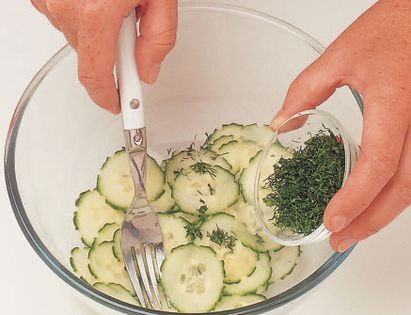 Salting the cucumber with the onions draws out some of the moisture, makes the cucumbers and onions silkier and helps to combine the flavours. Serve as part of a dairy lunch or selection of salads, with herring, chopped egg and onion, and boiled potatoes.