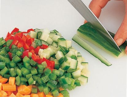 One thing you can count on in Israel for breakfast, lunch or dinner, is a salad of finely chopped vegetables. You can vary the herbs, add a pinch of spice such as sumac or cumin, and omit the chilli. Lemon or lime juice can be added instead of vinegar, and a handful of olives always makes a great addition.