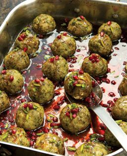 Years ago I was inspired by a sixteenth-century Persian cookbook to create this recipe and combine a mixture of pomegranate and grape molasses for the sauce. To my surprise, last year in Kerman, where they have the best of both pomegranates and pistachios, a local cook served me pistachio meatballs with a pomegranate sauce.