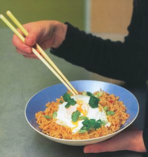 This is my vegetarian version of the famous nasi goreng - a tasty Indonesian rice dish. I have retained the traditional fried eggs, but you can easily omit them if you want a lighter meal. As with the recipe, the rice should be cooked several hours in advance, or even the night before.