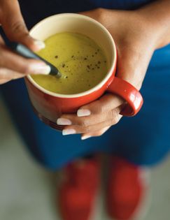Blend with a hand-held blender until smooth. Return soup to heat and add cre