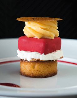 I don’t really eat too many sweets anymore, but when I do there is always a kickass sour element involved. Calamansi is a powerhouse of flavor and as you’ve gathered by now, one of my all-time favorite ingredients to pair with pastry. I begin with a round cake crouton soaked in calamansiorange syrup to anchor the stack. Next comes a caramelized almond crunch with some lightly sweetened whipped cream as the glue. The most