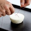 Peel and slice daikon to 4 equal rounds. Cut each daikon round into quarters without cutting all the way through. Use a red string to go around the daikon over the cross sections that you have cut. Secure the string with a knot at the centre.