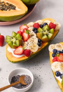 Cut the papaya in half, then scoop out the seeds and fleshy bits.