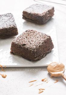 Combine the peanut butter powder, sweetener, cocoa powder, baking soda, and salt in the bottom of a microwavable mug or bowl, stirring to remove any lumps.