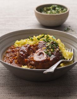 Season the veal shanks with salt and pepper, then dust with the flour, shaking off the excess. Heat 2 tablespoons of the oil in a large frying pan over a high heat. Reduce the heat to medium, add the veal shanks and fry for 5–8 minutes until browned on both sides, working in batches to avoid overcro