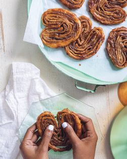 My love affair with palmiers began at a young age. My dad often went to New York City on business and would always bring back treats from our favorite bakery. His bag would be filled with croissants, Danish pastries, and palmiers. As a sugar lover, I would always be searching for the palmiers. The crunch of the pastry with the small granules of sugar was so satisfying and irresistibly sweet. These have a bit more depth, as they call for jaggery instead of sugar and include a bit of nutmeg f