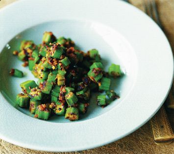 Bindi is the Hindi name for “okra.” In South Asia, okra is rarely cooked in water. Instead it is deep-fried or fried in a spiced oil–based sauce. This dish is a rather magical transformation of dull green okra into nuggets of flavor, with no sliminess, just good bite.