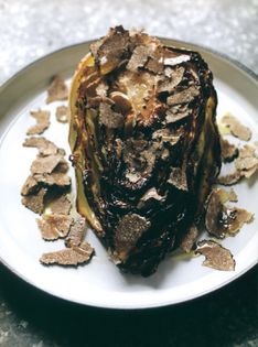 I first had this dish when Nobu opened in Mayfair. My mate Mark Edwards was experimenting with his new wood-burning oven and brought out this fantastic pointed green cabbage, also known as hispi or sweetheart cabbage. A wood-fired oven is the key to getting this dish perfect, but you’ll get a pretty good result if you cook it on a pizza stone in a red-hot oven. You can use black or white truffles for this depen
