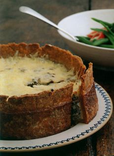 Lightly butter a 18cm loose-based, deep cake tin. To make the pastry, sift the flour into a bowl. Crush the garlic and salt to a purée using a pestle and mortar and place in a saucepan with the oregano, butter, tomato purée, water and pepper. Cook until the butter has melted and pour into the flour. Stir with a wooden spoon to make a smooth dough. Take pieces of the dough and use your fingers t