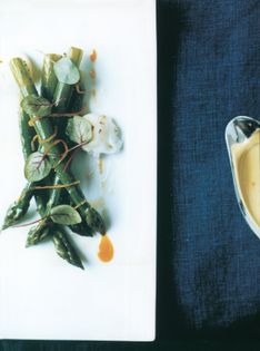 For the asparagus, bring a pan of salted water to the boil and have ready a bowl of iced water. Trim the spears and peel the lower part of the stalks. Add the asparagus to the boiling salted water and blanch for 2–3 minutes until just tender. Drain and immediately refresh in the iced water. Drain again and spread out on a clean tea towel.