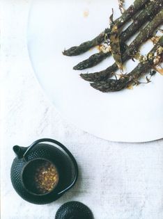 For the asparagus, bring a pan of salted water to the boil and have ready a bowl of iced water on the side. Meanwhile, trim the woody bases of the spears and peel the lower ends of the stalks. Add to the boiling salted water and blanch for 2–3 minutes until just tender. Immediately refresh the asparagus in the iced water to stop the cooking process. Drain and pat dry with kitchen paper.