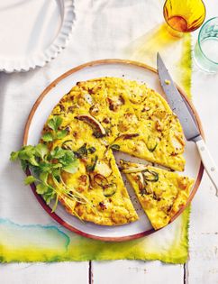 This gently spiced frittata makes a really substantial lunch and is great served with a simple dressed salad. It’s so versatile, the veg can be roasted ahead of time and you can swap in broccoli instead of cauliflower, or sweet potato instead of white potatoes, or swap cheese to dairy-free cheese if needed. You can even use leftover