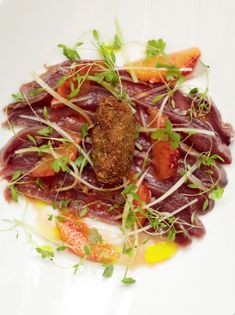 Bresaola is a traditional Italian air-dried salted beef that’s matured for 3-4 months, spiced with juniper, and brined in red wine which leaves it a rich dark red colour. This dish uses the same principle but with duck breast and needs much less curing. I use whole ducks, confit the legs and shred the meat into little rissoles which adds a hot crispy texture to the cured cold breast meat.