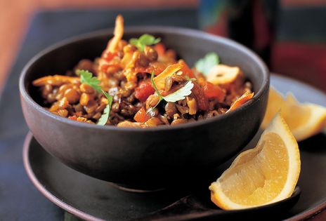Rinse the lentils well, and drain. Chop the peeled and seeded tomatoes. Heat 30ml/2 tbsp of the oil in a large pan and fry the onions until soft. Add the tomatoes, turmeric and cumin, then stir in the lentils. Pour in the stock or water and bring to the boil, then reduce the heat and simmer until the lentils are tender and almost all the liquid has been absorbed.