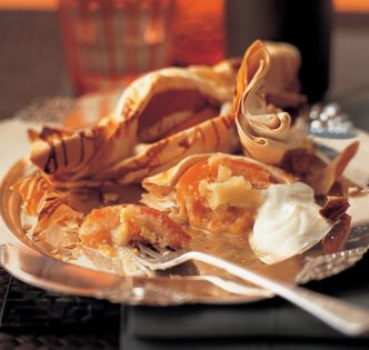 These parcels can be made with dried apricots poached in syrup and then stuffed, but I prefer to use fresh fruit as it lends a juicy tartness to the otherwise sweet dish, which the dried fruit does not possess. Roll or twist the filo parcels into any shape or size, just make sure you leave them open, so that the fruit and pastry benefit from the honey glaze.