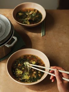 I have a great fondness for these Korean-style soups that are abundant with punchy herbs, flavour and texture, and I especially love the way the glass noodles yield their elastic charm when you drop them into the soup. I add minced/ground pork to this but you can change that for tofu or bean-curd sheets if you prefer, both of which are equally capable of adding interest and texture.