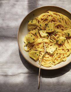 I must confess that the spark of an idea for this recipe started in a department-store café, when I tasted something similar, loved it and decided to try and recreate it at home. It soon became a family staple and it’s one of the few dishes that my daughters actively sought out the recipe for. The sharp tang of the lemon combined with the nursery comfort of the pasta is reminiscent of the zingy crêpes that are so beloved in my household. It sounds odd, I know, but do give it a try – it’s a