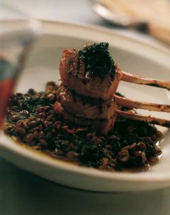Grilled lamb chops have been a favourite meal since I was old enough to hold a bone. That’s what comes of growing up on a sheep farm. These days, I like them well trimmed (I buy trimmed racks of lamb and chop them myself) and cooked fast and rare, served with plump, juicy lentils or, if I’m regressing, mashed potatoes and a million peas.