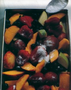 Peel and roughly chop all fruit as appropriate, and arrange in a jumbled layer in a large buttered pie dish or baking tray. Sprinkle with caster sugar. Top with crumble topping. Bake