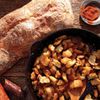 In Spain (and in Portugal too), in an effort to waste nothing, old bread is turned into migas, essentially nothing more than rough cubes of dried bread fried in olive oil. A few drops of water, a generous splash of oil, and a goodly amount of garlic seem to magically bring even very dry bread back to life. Migas, which originally masqueraded as meat for a poor shepherd’s meal, is still prized today as a delicious tapa, served warm and dusted with pimentón. It is undeniably hearty far