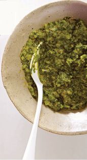 This traditional hot green, herby condiment is served in little jars at my favorite falafel joint in Paris (they serve jars of harissa too)—when they’re in the mood to make it. I always ask for it, but some days it’s simply not there. No point in asking why, all you get is a shrug. A day without green sauce is a sad one, so I came up with my own, which, slathered into a pita with hummus and tomatoes (or a little grilled lamb), tastes mighty authentic. Try it too in non–Middle Eastern ways,
