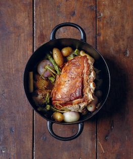 Melt the butter with the oil in a flameproof casserole dish on a low heat and brown the rack of veal on all sides.
