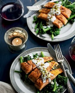 We’re all trying to get those healthy omega-3s into our diets, and if you haven’t tried it yet, arctic char should be a healthful-oil-filled and delicious new addition to your seafood repertoire. Similar to salmon, with its brightly colored flesh, char’s clean, rich flavor plays very nicely with Indian spices. Here, garlic, ginger, and the spice blend garam masala flavor the fish and leggy broccolini while a tangy, minty yogurt sauce and green pistachios add color, crunch, and the illusion