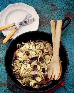 Because of its firm, meaty texture, I think of halibut as the strip steak of fish. Its light fresh taste is perfectly delicious in this, one of my favorite incarnations—cooked over a bed of browned potatoes with a shower of herbed, lemony vegetables steaming on top. The “salad” of lemon, capers, fennel, and zucchini releases flavorful juices and perfumes the fish and potatoes as they steam in a hot, hot oven.
