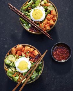 Bibimbap (BEE-bim-bop) is a delicious Korean dish of rice, sautéed vegetables, fried egg, spicy chile sauce, and kimchi. Gochujang is a chile sauce; and though it may take a trip to your Asian market to find it, you’ll be so glad to have this flavorful condiment in your fridge the next time you want to make a tasty barbecue sauce or glaze. Traditionally, the vegetables in bibimbap are cooked separately and arranged beautifully on top of the rice, but I think you’ll appreciate the time-savin