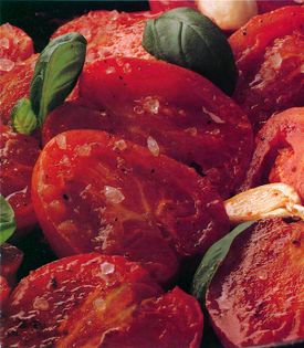 The best tomatoes to use for this recipe are plum tomatoes. These have a much better taste and hold up better when cooked. If you are using salad tomatoes, only cook for 5-6 minutes. This dish eats well as a vegetable or vegetarian main course finished with chopped black olives, capers and Mozzarella or Parmesan (almost pizza-like) browned under the grill. They also eat very well with grilled fish or meat, in particular, lamb.
