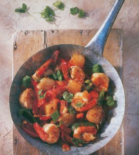Manchego is Spain’s best-known cheese and, when fresh, has a mild, creamy consistency. Many Spanish recipes begin with instructions to prepare a sofrito-onions, garlic, tomatoes and sometimes parsley, cooked slowly to make a thick, intensely favoured savoury base. This particular dish is of Mexican-Spanish origin and could be made with almost any seafood. Try lobster or scallops for an extravagant version. Saffron rice makes a good accompaniment.