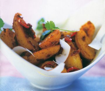 Heat the ghee or clarified butter in a frying pan, add the onion and cook over a low heat until translucent. Add the potatoes, chilli, turmeric, ground coriander, cumin seeds and a little salt and fry for 10-15 minutes, until the potatoes are lightly browned.
