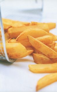 Peel the potatoes, rinse under cold water and then dry on kitchen paper. Cut them into strips about 1cm (½ in) wide by 5-7.5cm (2-3in) long.
