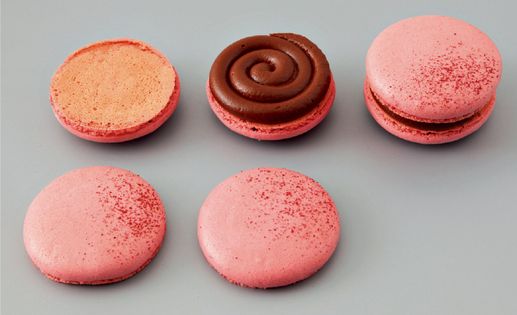Make the ganache and spoon into a piping (pastry) bag fitted with a 10mm (½ inch) plain nozzle (tip) ready for piping once firm. Preheat the oven to 150°C (300°F/Gas 2). Prepare and bake 36 macarons. Pipe a spiral of ganache on the flat side of half the macarons,