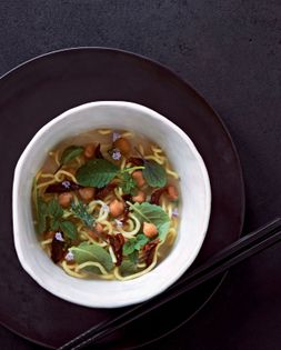 Heat the kombu, water, and dried shiitakes in a large pot. Bring the water almost to a simmer, then turn it down to low. The water should have steam coming off the top, but not reach a simmer. Cook for 40 minutes, stirring occasionally. Pull from the heat and place in warm place. Cover the pot and let the broth steep for an hour. Whisk in chickpe