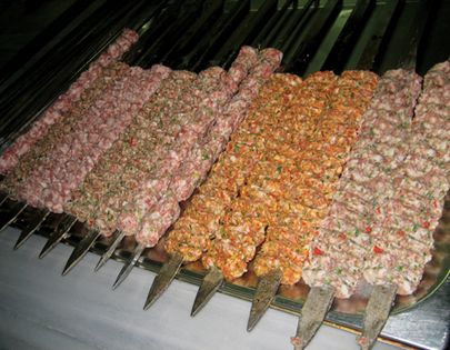 A selection of Turkish minced lamb kebabs. From right to left: sebzeli kebab (vegetable kebabs), adana kebab (hot peppe