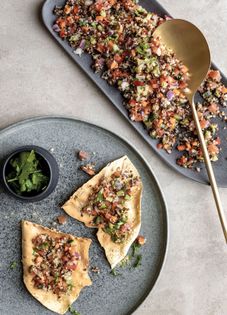 In northern India, the most common salad is generally known as kachumber. With crisp cucumbers, tomatoes, onions, and enticing chāt masālā, it is a refreshing side to nearly any meal. I like to add quinoa for a nutritious boost of protein and fiber, but you can certainly omit it, and you can reduce the amount of lime juice and chāt masālā if you prefer the salad in its simplest form. Cooked amaranth or farro may also be used in place of quinoa, if desired.